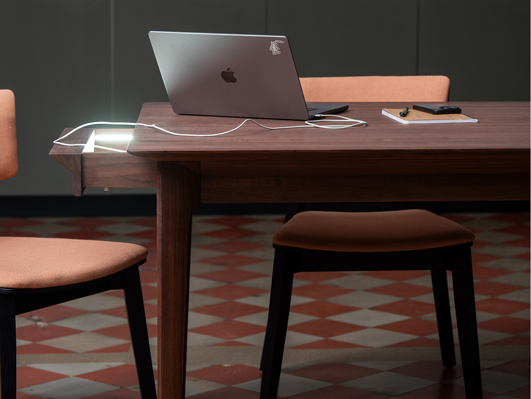 Szuflada wyposażona jest w oświetlenie LED oraz media port z gniazdkiem i portami USB, co zwiększa jej ergonomię, nie zaburzając minimalistycznego designu.