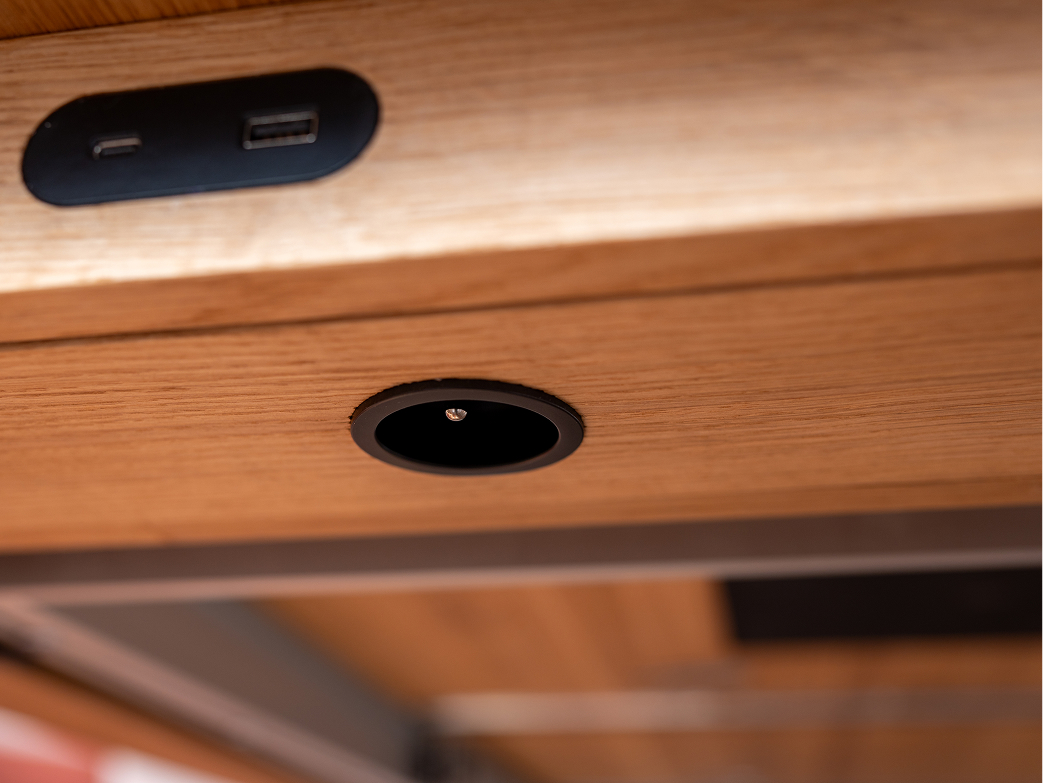 Na multifunkcjonalność stołu składają się porty USB ulokowane przy bocznej krawędzi blatu, a także gniazdko wbudowane pod nim. Detale funkcjonalne mebla uzupełnia zintegrowana z blatem ładowarka indukcyjna. Dzięki przemyślanej formie wszystkie dodatkowe udogodnienia Nivo pozostają subtelną częścią konstrukcji, podkreślając jej spójność oraz innowacyjność.